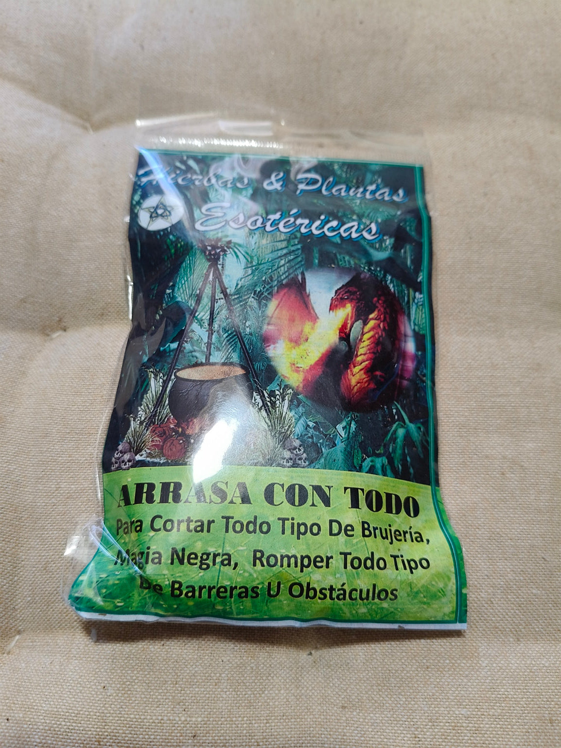 Las hierbas "arrasa con todo" se utilizan en lo esotérico para realizar limpiezas energéticas profundas, eliminar obstáculos, romper maleficios y proteger contra energías negativas como el mal de ojo, la envidia y la hechicería. Se usan en rituales y ceremonias para barrer barreras espirituales y contrarrestar trabajos de magia negra, a menudo en productos como velones, aceites y aguas espirituales.