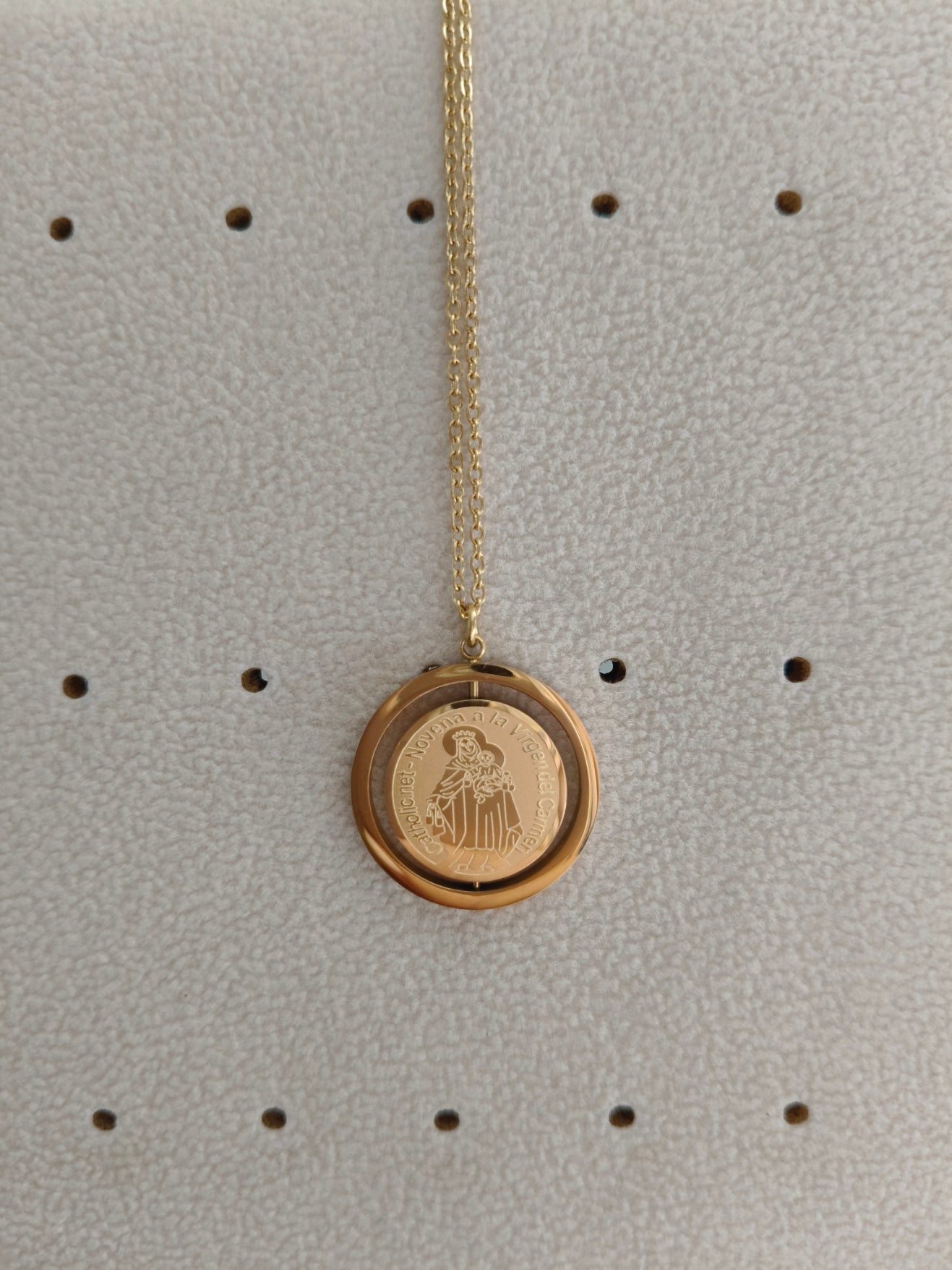 Es un colgante de acero dorado de la virgen del Carmen, giratorio.