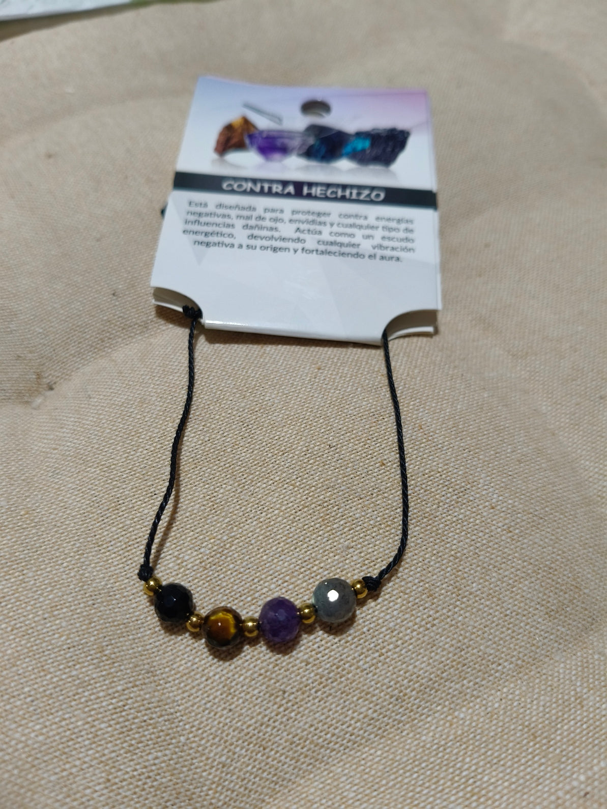 Las pulseras contra hechizos se consideran amuletos con propiedades esotéricas de protección, bloqueo de energías negativas y, en algunos casos, atracción de la buena suerte. Sus propiedades varían según sus componentes, pero en general se cree que crean un escudo protector contra el mal de ojo y las vibraciones negativas, ayudan a equilibrar el campo energético y promueven el equilibrio emocional y la conexión espiritual.