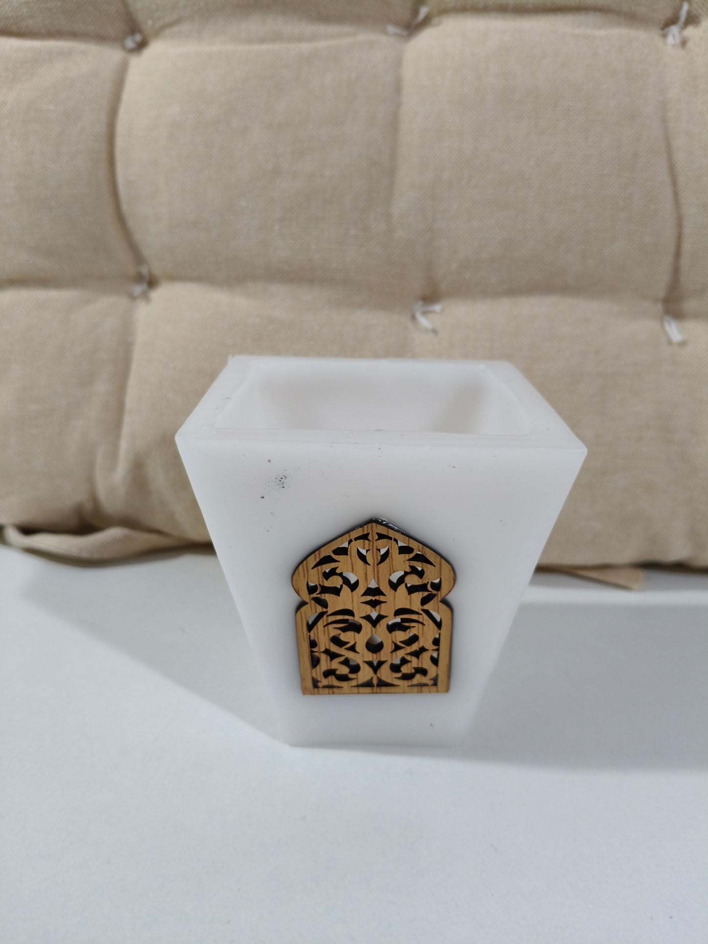 Portavelas estilo árabe con vela de pilas incluida.