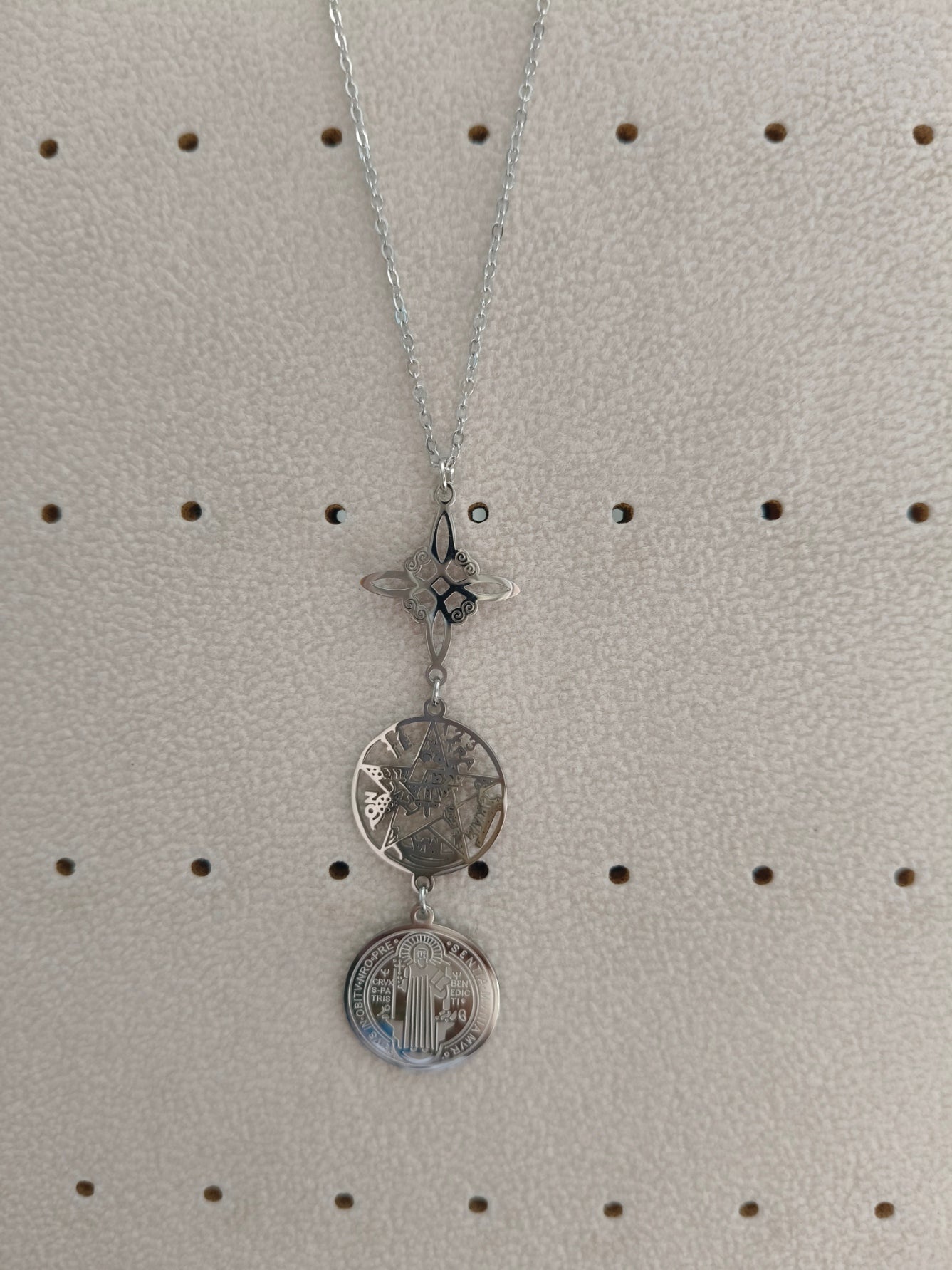 La triple protección, combinando el Nudo de Bruja, el Tetragramatón y la Medalla de San Benito, se considera un amuleto potente contra diversas energías negativas. El Nudo de Bruja se asocia con la protección contra hechizos y malas intenciones, el Tetragrámaton como escudo energético, y la Medalla de San Benito como símbolo de protección espiritual contra maleficios.